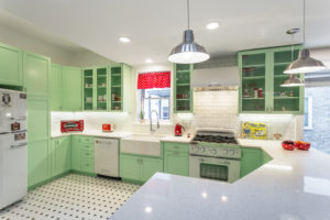 For a brighter look, you could go with a mint green, for a retro kitchen featuring light quartz countertops, a white subway tile back-splash, and white and black tile flooring. The 1950s retro appeal brings to mind an old-school diner.
