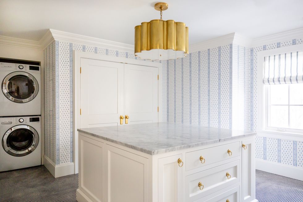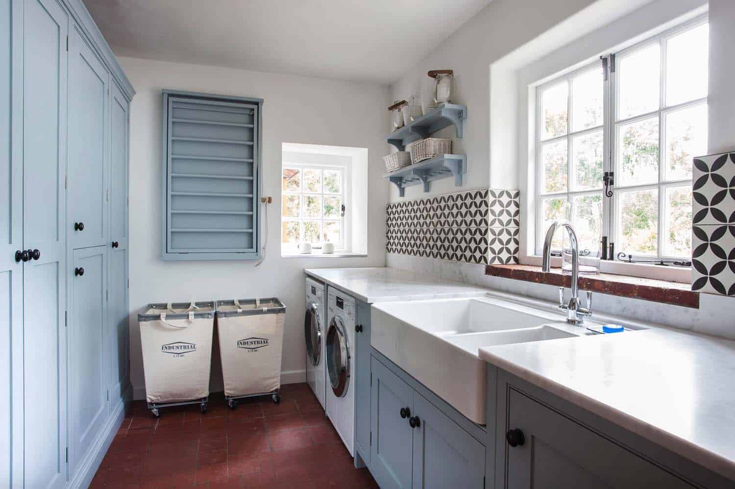 This laundry room uses soft baby blue cabinetry to make a statement that is sure to please. Light Marble countertops paired with a farmhouse kitchen sink, really gives this laundry room it’s own unique style. Don’t forget a fun accent tile, like the funky pattern on this backsplash.