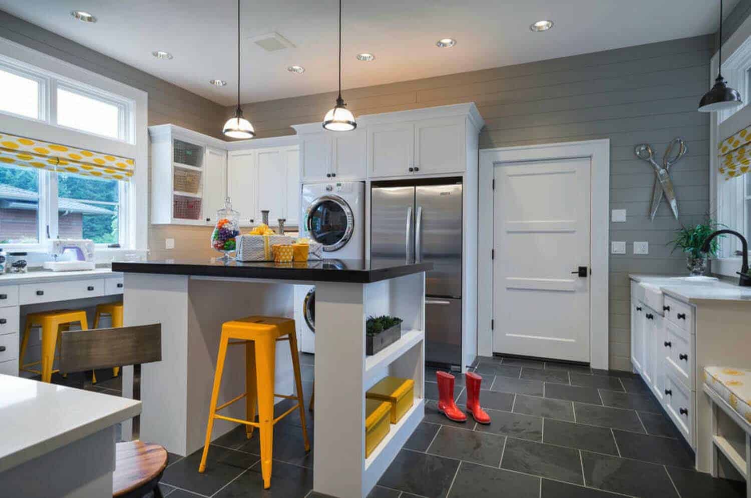 This space features a laundry room with extra amenities, a folding counter, place for crafts, sewing area, an extra fridge, cabinetry storage and a built-in bench. If you’ve got the space to spare, you might as well make it as functional as possible!