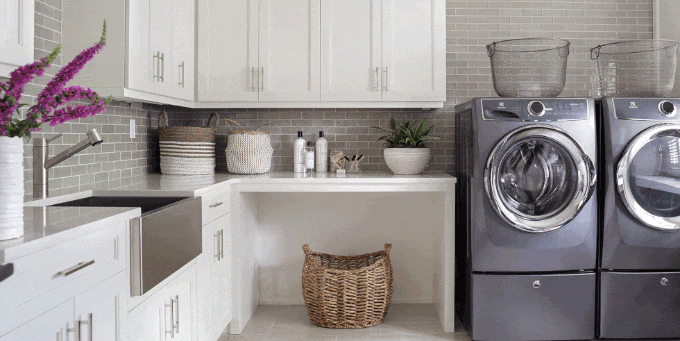 Woven baskets and plants bring warmth to any space. Everyone wants to feel clean in their laundry room, with the combination of white cabinets and countertops, there is plenty of room for some earthy accents to blend clean and warmth into your small space.
